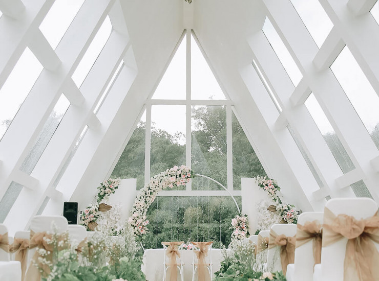 Крытый зал, специально оформленный в соответствии с вашим личным вкусом для интимной свадьбы. Орнаменты наносятся на все место, руководствуясь чертой пары.