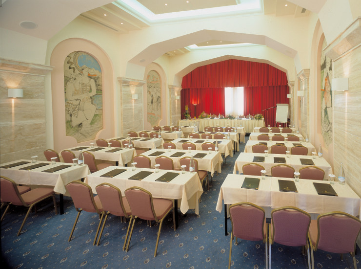Великолепный многофункциональный зал Academia находится на первом этаже и вмещает до 450 человек при расположении мест в театральном стиле. Этот актовый зал округлой формы с шикарными люстрами Murano полностью оснащен специальной современной аппаратной, стационарной сценой, проекционным экраном с дистанционным управлением, купольной камерой, управляемой с помощью компьютера, блоком видеоконтроля, проектором данных и видео (1500 люменов), CD/DVD-плеером и видеоплеером, специальной системой освещения с регулятором силы света, беспроводными микрофонами, проводным и беспроводным доступом в Интернет, а также возможностями для синхронного перевода на 5 языков.