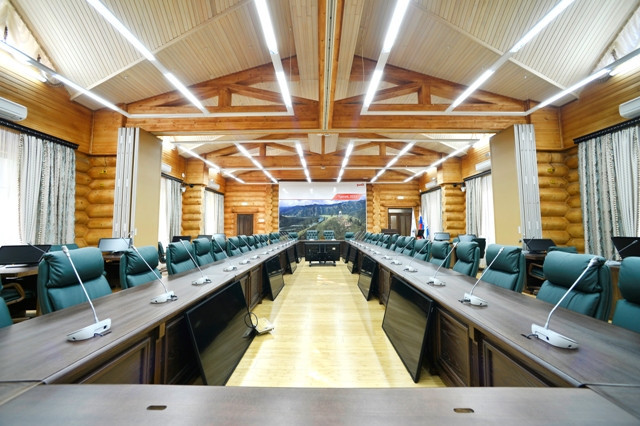 Конференц-зал расположен в самом сердце базы, в шикарном срубе из кедра, он представляет собой просторное помещение с панорамными окнами, благодаря которым создается ощущение пространства и легкости, и открывается вид на сосновый лес и первозданную природу Горного Алтая. Вместительность зала позволяет проводить мероприятия численностью до 100 человек. Зал оснащен новейшим оборудованием для проведения конференции, семинаров, вэбинаров любой сложности. Благодаря современным технологиям и технической поддержке, комфортной мебели и профессиональному сопровождению, Ваша аудитория будет под впечатлением от любой Вашей презентации или доклада.