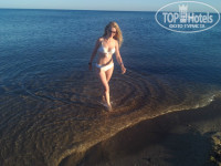 Пляж: ближе к берегу - песок; на мой взгляд, достаточно широкий. До пляжа идти по дорожке бетонной минут 7, не более. Вход в море пологий и разный - и песок, и камни. Зонты и шезлонги бесплатно. Минус, что по проросшей, уже высохшей траве на территории пляжа, не совсем удобно ходить босиком.
