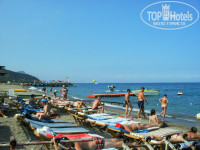ПЛЯЖ. Идти до него минут 5-7. Территория маленькая. Здесь галька, как мелкая, так и крупная. Поэтому ходить здесь и купаться можно только в специальной обуви. Лежаков почти всегда хватает, если ходить до 12.00 или после 19.00. Минусы: неудобные кабинки для переодевания, душ, полное отсутствие туалета.