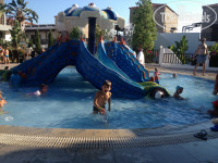Прилетели мы около 12-и часов дня, добирались до отеля около полутора часов, в общем заселение пришлось как раз на 14-00, по этому проблем с ожиданием не было никаких! В ваучерах было 2 двухместных номера, на ресепшене мы попросили заменить их на один большой номер - без проблем заменили. Сразу скажу, номер нам дали на первом этаже (как многие здесь говорят полуподвальный, но никаких неудобств это нам не доставляло, ни сырости, ни насекомых, ни каких-то посторонних запахов не наблюдалось). С шумоизоляцией проблем не испытывали, лишь пару раз было слышно как соседи сверху двигали зачем-то мебель. Номер действительно был большой двух комнатный, с двумя кондиционерами в первой комнате, она же прихожая две полно размерные односпальные кровати, комод и большой платяной шкаф. затем ванная комната в ней джакузи, душевая кабина унитаз и две раковины, всё чистенько, прилично, но вода из ванны действительно стекалала медленно и через дверцы душевой кабины вода протекала на пол, приходилось всё время подстилать полотенце, далее большая комната в ней двухспальная кровать, диванчик, шкаф, две тумбочки, столик туалетный, холодильник и телевизор, балкон - на балконе сушилка для белья, столик два стульчика, и ступеньки к бассейну, у бассейна два шезлонга которые как бы относятся к нашему номеру, но на самом деле не все отдыхающие так считают, и частенько мы придя с моря находили наши полотенца рядом с шезлонгами, а на самих лежаках находились незнакомые нам тела (но к отелю это не имеет отношения - это РУССО ТУРИСТО), а вообще национальный состав примерно такой больше всего в отеле немцев и русских, наверное поровну, а так же немногочисленны поляки, итальянцы, французы и греки, но дискриминации по национальному признаку ни к нам ни к детям со стороны персонала не наблюдалось.