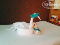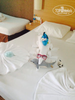Летели с а/компанией UTair, туроператор Anex тур. Перелет прошел нормально, трансфер до отеля тоже. В отеле были уже в 12-00. В паспорт сразу положили 20 евро, чтобы заселение прошло побыстрее. Через пол-часа нам дали номер двухместный, еще через несколько минут принесли раскладушку для младшего ребенка. 4 раза я ходила на ресепшен, просила принести нормальную кровать, а не раскладушку, я не скандалила, не истерила, а просто спокойным тоном просила дать нормальную кровать. К вечеру пришел какой-то мастер и принес еще один большой матрас на раскладушку. Сказали, если хотим 3 кровати, то надо с утра прийти на респешен, может появятся свободные номера. На следующее утро, я в 5-ый! раз на ресепшене просила другой номер и 5-й раз работник записал наш номер на бумажке, но к обеду нам дали просто потрясающий номер с видом на море и бассейн, где проходила вся анимация, и пенная дискотека была прямо под нашим балконом и площадью он был гораздо больше первого (без всяких доплат). В общем настроение у нас было приподнятое! Поэтому, если хотите хороший номер, будьте готовы проявить настойчивость и терпение) Кстати, работника ресепшен, который нам помог поменять номер звали Али.