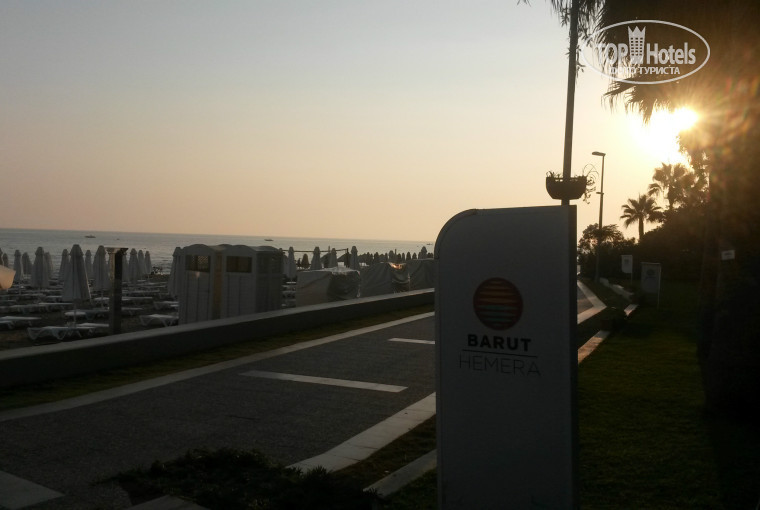 ПЛЯЖ общественный, часть (где лежаки, волейбольная площадка, пирс) арендована (это нам рассказали сотрудники отеля, когда разговорились). Лежаками и пирсом могут пользоваться только посетители Барута, но лежать на песочке перед лежаками и ходить туда-сюда по берегу никому, естественно, не запрещается. Это, как сказали, у всех близлежащих отелей так. Но только вот дорожка к пляжу именно рядом с Барутом (и соседним Дефне), поэтому многие из местного населения и туристов из дальних отелей предпочитали не ходить далеко и располагаться на пляже возле Барута, следовательно, с левой стороны от пирса очень часто наблюдалась картина как на пляже Анапы (не в самый высокий сезон, но тем не менее иногда приходилось обходить многих по пути к морю). Еще и полотенчики-"лежаки" у этих отдыхающих с надписями "Анапа", "Геленджик":))) Но с правой стороны от пирса их практически не было (там преимущественно и расположены камни в море). Поэтому мы большую часть отдыха располагались на лежаках в правой части, купались иногда тоже справа (там есть места на мелководье без камней), иногда для разнообразия в левую часть ходили. Т.е. по сути как таковой проблемы общественный пляж не составляет, но всё ж факт фактом, надо быть готовым.