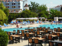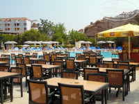 Питание отличное, не удержалась, чтобы не налечь на сладости (много разнообразных) с сухим белым вином. Каждый день новый супчик. Курица, рыба, мясо, много овощей - и сырых, и тушеных, и солений. Макароны, рис, картошка. На завтрак - яйца в разных видах, овощи, йогурты, к ним различные наполнители. Фрукты - каждый день арбузы, были персики, сливы, яблоки. Фрукты также приносят в бар на пляже часиков в 11 утра. Попробовали раки. Если развести побольше (и лучше не водой, а спрайтом), то приемлемо. Пиво нормальное. Очень вкусный айран, холодный, в баре во дворе (в автомате). Вечером - гриль: мясо, рыба (по очереди).