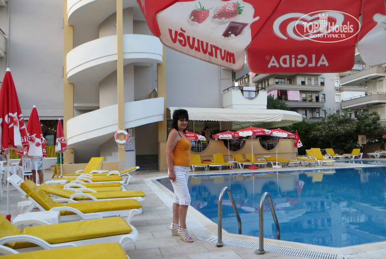 Я отдыхала в этом отеле 4-ый раз. В этом году с 8 июля по 22 . Мне нравится отдыхать здесь, море рядом, вышел из отеля и в городе. Питание мне нравится. голодной не была ни разу, с моря идёшь можно зайти в бар и там перекусить. Обожаю турецкие супы. В меню были вторые блюда из курицы и рыбы. Я куру не ем, но мне хватало , то что было. Были разные выпечки, пироженое, блины,яйца, много различных салатов, сыр.