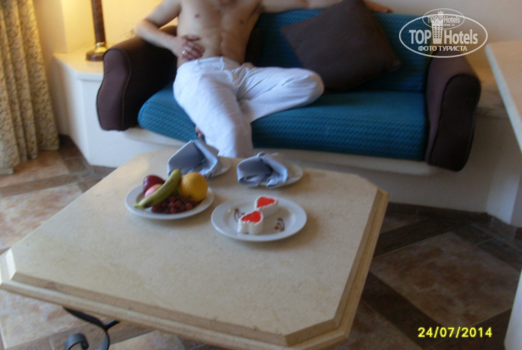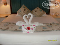 Как всегда, я написала письмо в отель с просьбой о размещении, на этот раз в 4 корпусе, в предыдущие разы были в 7 и 5. Хочу сказать, что, несомненно, 4 корпус самый удачный по расположению, но все таки на мой взгляд особо заморачиваться на этом не стоит, все корпуса так же комфортабельны, исключение составит, пожалуй, только 1, так как без балкона. Но, как пример, мы познакомились с парой, и они предпочли остаться в 1 корпусе, хотя им предлагали поменять на 7. Так что каждому свое. Так вот, мы прилетели, на ресепшене заполнили анкету и нас попросили пройти пообедать, после непродолжительного ожидания нам были выданы карточки и мы направились в номер 4 корпуса на 3 этаже, как и просили в письме. В номере нас встретили на одной большой кровати два лебедя и выложено сердце из полотенец, украшенное лепестками цветов. Так же на столе стояла тарелка с фруктами и тарелка с пирожными в форме сердца. Вы знаете, мелочь, но ведь так приятно. Два раза нам позвонили и спросили все ли нас устраивает и всем ли мы довольны. Мало того, но наш номер, кстати, 4211, оказался угловым и стоя на балконе нас, вообще никак не беспокоили и не видели соседи других номеров. Кстати о балконах, мне в свое время так и не удалось выяснить, какого все-таки размера балконы на 3 этаже 4 корпуса, так вот они вполовину меньше, чем на других этажах. Но это только в 4 так, в 5 на 3 этаже большие. Единственным минусом оказалась дверь в соседний номер, как мы поняли в ванную комнату соседнего номера. За обычной дверью располагалась глухая другая дверь, но вот слышимость, конечно, была высокая. Но мы вышли из положения, достали из гардеробной второе одеяло и повесили его между этими дверьми и все, более нас ничего не беспокоило. Уборщик все понял и одеяло не трогал Убирался исправно, оставляли по 2 доллара. Тапочки и халаты в номере присутствовали. Мини бар пополнялся каждый день, кола, фанта, спрайт и, так как мы не первый раз, то нам приносили соки в пакетах и пиво в банках. Где то раз в три дня нам так же приносили пирожные или печенье на тарелочки и так же раз в три дня тарелку с фруктами. Очень приятно. В этот раз в прачечную не обращались, хотя нам полагается один раз бесплатно, в предыдущие разы всегда отдавали, все отлично. В номере бесплатный проводной интернет.