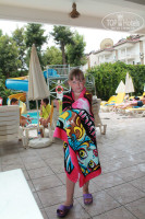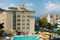 Отдыхали в этом отеле в конце июля-начале августа 2014 г. семьей, с детьми 7-8 лет. Учитывая звездность отеля "3" - он более чем соответствует своей категории. Расположение отеля замечательное, 2 минуты ходьбы до пляжа, расположен в городе, магазины, аптека - все рядом. Питание вполне приемлемое, из фруктов были арбуз, дыня, апельсины, много сладостей, выпечка, из мяса- в основном курицы и ее субпродукты, но вкусно, часть пищи довольно-таки острая, но выбрать есть что. Много свежих овощей - салаты, тушеные овощи, омлет, макароны, рис... Днем у бассейна с горкой готовят картофель фри и другие блюда, всегда есть что перекусить. У бассейна без горки - потрясающий лаваш с начинкой, выпекает женщина прямо при вас. Из напитков - что-то типа "юппи", кофе, чай, вода, по утрам - еще и молоко. В отеле 2 корпуса, мы жили в том, где столовая. У каждого корпуса есть бассейн, у второго корпуса бассейн с водной горкой. При каждом бассейне есть рядом "лягушатник". Уборка в номере ежедневно. Персонал вежливый. из номера ничего не пропадало, но как принято, перед уборкой оставляли 1 доллар для уборщицы. При каждом бассейне бар, в баре бесплатно лимонады, пиво, вино, местная водка "раки", и просто водка, другие напитки платные. Спиртные напитки и сигареты в магазинах дорогие, лучше привозить с собой. Сейф в номере платно, но не дорого. Холодильника нет. Кондиционер бесплатно, работал хорошо. Номер у нас был 525, угловой, рядом выход по винтовой лестнице к бассейну и бару, вид на горы, территорию отеля и море. в отеле 2 лифта, тот, что слева - работает плохо, тот, что справа - получше. в отеле есть фотограф, фотосессия - минимум 10 фото, 1 фото 4 доллара, либо распечатает, либо запишет на диск, если и то и другое - за все придется платить. Разместили быстро, в течение 30 минут по приезду. В целом довольны отелем, рекомендуем для экономичного семейного отдыха с детьми. Ранее в 2012 г. отдыхали вдвоем с 5-летней дочкой в Тунисе (Монастир) в 4-ке, а в прошлом году с мужем в Тайланде (Патайя), есть с чем сравнивать. Для спокойного отдыха вполне подходит.