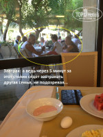 3. Публика: опускаю инфо про нетрезвых русских. Но! Отдыхают здесь не только русские. Есть еще турки, но их немного, очень много отдыхающих из Средней Азии и Украины. В целом, если говорить о поведении многих отдыхающих в этом отеле, интеллигентному, воспитанному человеку в этом отеле будет трудно! В целом контингент бесцеремонный – на моих глазах молодая пара заняла место на завтраке – на стуле оставили сумку, после чего девушка с парнем ушли за едой. А в это время к столику подошла другая женщина, убрала чужую сумку, поставила свою тарелку и ушла за напитками. Парень с девушкой пришли, удивились, но потом решили не конфликтовать и ушли искать с сумкой и тарелками другой столик. Ну, и маленький «бантик» - сделала фото (см. фото) на завтраке: за столом жена, муж (курит), а рядом прямо на столе сидит «с ногами» их ребенок и ползает на этом столе из стороны в сторону. Хорошо, хоть взрослые с ногами не сидели, хотя… может быть, я этого просто не заметила. Привет тем, кто будет сидеть за столиком после них!