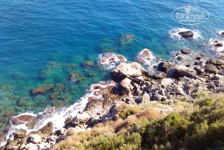 Море очень чистое и тёплое. Мы все плавающие, поэтому нырять с мостика всем очень нравилось. Плавали с масками, очень интересно наблюдать за рыбками. На платформе организован водный спорт: с удовольствием полетали на парашюте, покатались на "диване" и погоняли с сыном на скутере. Там же на песке поиграли в бочу, интересно. Играли также в дартц, волейбол, настольный тенис и даже из лука постреляли. Ездили на бесплатном автобусе на дикий пляж, а однажды ходили через мыс пешком. Очень красиво и интересно. На диком пляже вход в море пологий, есть и песок, и мелкие камешки, и галька. Выбирай, что больше нравится!