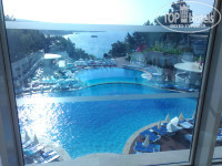 Территория отеля просто замечательная: очень большая, ухоженная, обалденно красивая. Есть где погулять, уединиться. Сосны, скалы, цикады, море, клумбы, воздух прекрасный. Везде есть лежаки и под соснами, где можно просто отдохнуть, почитать, и в аквапарке, и на платформах у моря. Очень удачное расположение самого отеля: немного вдали от основной дороги (нет шума траффика) и, как бы, на мысе (вокруг нет других отелей, а только море, сосны и скалы). В аквапарк дети ходили раза три, им понравилось. Около бассейнов мы не отдыхали, т.к. любим море, но бассейны большие, чистые, красивые, да и анимация вся, в основном, там.