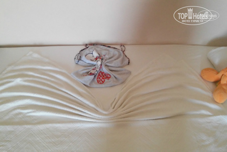 Номер нам дали в основном корпусе с видом на море. Поспособствовал скорейшему нашему заселению Николай, который работает на ресепшене, причем было предложено несколько вариантов, из которых мы выбрали самый подходящий для нас. Уборка номеров осуществлялась ежедневно, особенно порадовало креативное застилание кроватей. Бар в номере пополнялся ежедневно безалкогольными напитками.