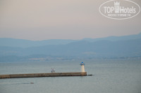 Ближайший город в 3 км, ехать только на такси, т. к нет пешеходных дорожек, только проезжая часть, там есть ресторанчики. Дорадо на гриле 65 евро за 1 кг, рыба вытягивает гр на 400, т.е. дешевизны не ждите. Там же есть паромы на материк, билет 2,5 евро, очень понравилось кататься. В ресторане заказывали их знаменитый кофе фраппе, вкусненько, а в отеле тебе разводят растворимый с сахаром, гадость. Еще в отеле есть мороженное, всегда доступно, дети объедались.