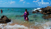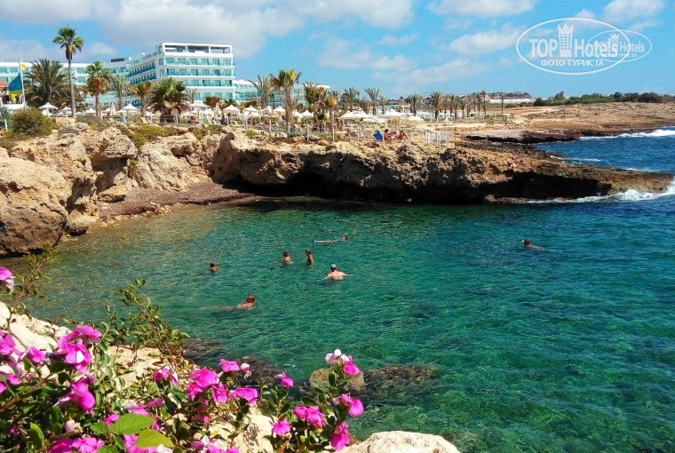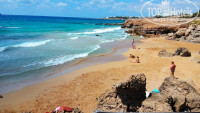 По отзывам узнали, что пляжа у отеля нет, но, приехав, ничуть не расстроились, так как в 50 метрах (справа, если смотреть на море) есть бухточка, где нет волн! Вола – чистая бирюза… Ходили часто и на песчаный пляж, что метрах в 250-300 в другую сторону, там можно «покачаться» на волнах, но это действительно на любителя, так как волны приличные... А еще, если сесть на 615 автобус (остановка находится рядом с отелем, перерыв между автобусами 10-15 минут) и поехать влево, доедете до пляжа coral bay, там тоже «лазурный берег» Кипра. А если поехать направо, до конечной 615-го – там городской пляж со множеством кафешек и магазинчиков! Там тоже городской пляж, удобный спуск к воде, и вода в море прохладненькая ))) Причём много русскоговорящих продавцов, владельцев кафе (и обслуж. персонала).