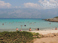 Море прохладное, прозрачное. Подводного мира там нет. Единственное что можно увидеть это небольшие рыбки и морские ежи. Мусор периодически проплывает такой как пластиковые стаканчики, тарелки. В общем все зависит от отдыхающих. Но это редко. Дно песчано-галечное и местами с водорослями (очень неприятно на них вставать). Вообще, судя по цвету моря в центре Мармариса, на пляже отеля оно чище. Вблизи от отеля находится дельфинарий и аквапарк (очень условное название, несколько надувных сооружений).