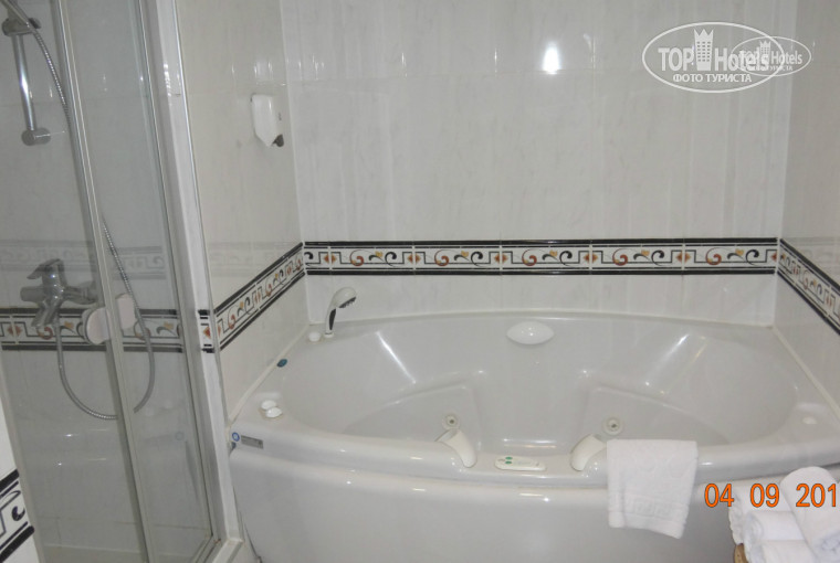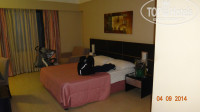 Ехать из аэропорта минут 40. В отеле были часов в 6 утра. По приезду сказали, что свободных номеров нет, придется ждать до обеда. Но через несколько минут к нам подошел администратор и предложил вместо трех номеров один огромный президентский сюит (судя по описанию это Jakuzzi Suite). Мы согласились, так как с маленькими детьми в столь раннее время выбирать ни желания, ни возможности не было. Номер огромный (квадратов 100, не меньше), на шестом этаже основного здания с прямым видом на море. В номере имеется большая спальня с джакузи, большая гостиная с огромным ЖК-телевизором и еще одна небольшая спальня (санузел в холле). Распределили неравномерно. Я со своей семьей поселился в большой комнате, братишка с семьей в маленькой, маме досталась гостиная. Все было хорошо до первого вечера. В день заезда как-раз было шикарное шоу прямо напротив нашего номера. Звук был невероятно громким, почти не было слышно собеседника. На следующий день спросил у девочек на ресепшене, как часто проходят такие грандиозные шоу, на что мне ответили, что каждый день, и с детьми лучше переехать в другие корпусы (как оказалось, подобное шоу напротив основного корпуса за 10 дней проходило один раз, но звук с амфитеатре все же доходил). Решили поменять наш большой номер на три стандарта, как это предполагалось ранее. Не только по причине звукоизоляции, но и просто трем семьям было не совсем комфортно жить в одном, хоть и прекрасном, номере. В этот же день предложили номера в третьем корпусе (на 5 и 4 этажах). Сказали, что имеется вариант со вторым корпусом, но его нужно будет подождать еще сутки. Решили подождать и взять номера на втором этаже второго корпуса, так как там обещали номера с увеличенной площадью.