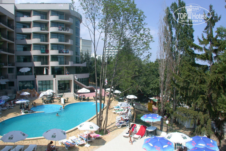 Территория отеля и природа - хоть и рядом с пляжем (30 метров), вокруг - зелень, деревья и ели.