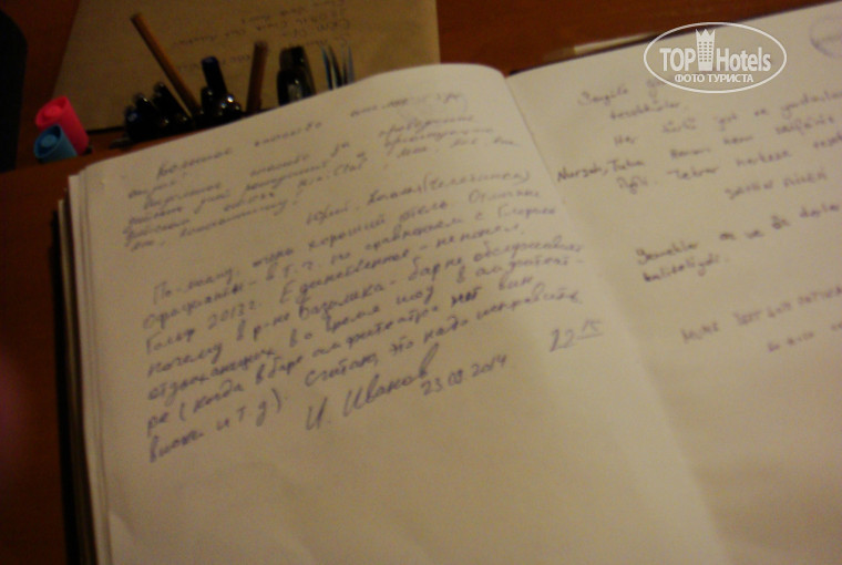 Отмечу и недостатки: что с сосен сверху падают веточки - на стол (в обед и ужин - если есть не в ресторане, а "на улице") - тут ничего не сделаешь: мать-природа (которую надо беречь). И - отметил в книге Предложений (смотри фото) - такую тонкость. В амфитеатре вечером шоу устраивают. При этом бар при амфитеатре работает - вино, пиво, шампанское, соки.. А почему нельзя вискаря или Мартеля, или Хенесси? Я зашел в Базилику - рядом (на самом верху горки между Отелем и море: впрочем, как и вход в амфитеатр) французский ресторан. В нем бар есть. Попросил налить.. По-очереди вышли трое (официант, потом маленький начальник и начальник по фамилии АТА) - думали долго, но сказали - нельзя.