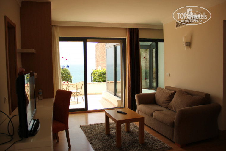 У нас был оплачен стандартный номер, но т.к. к нашему приезду свободных стандартных номеров в основном здании рядом с нашими друзьями (они прилетели на пару дней раньше) не было, за дополнительную плату поселились в Джакузи Сьют на 7-м этаже. Номер просторный, чистый, мебель в хорошем состоянии, с шикарным видом на море с одной террасы и с видом на горы с другого балкона, джакузи! Немного по ночам мешал шум, доносящийся с соседнего отеля, приходилось закрывать балкон.