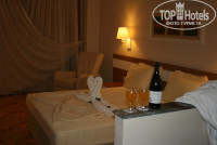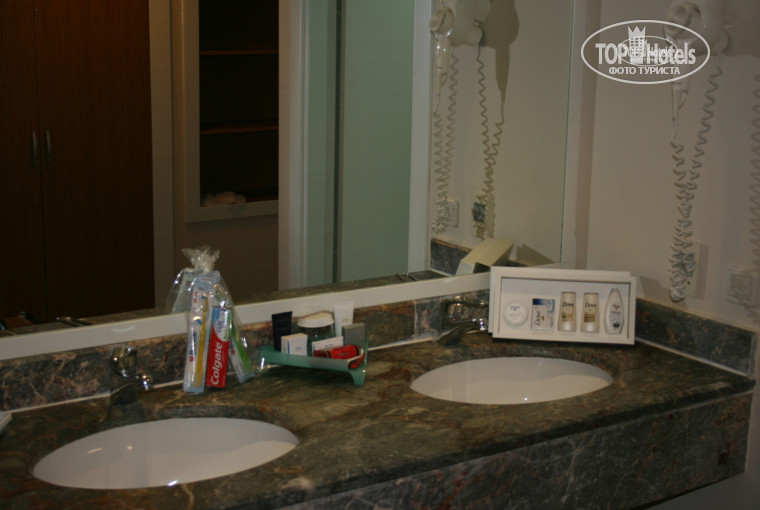 Номер стандартный, в номере - фен, тапочки, халаты, ватные палочки, шапочки для душа, мыло, зубная паста, щетки, шампунь, бальзам для тела, кондиционер для волос. Бар забит напитками - пиво, минералка, пепси, фанта, швепс, питьевая вода. На столе - фрукты, вино, сладости какие-то.