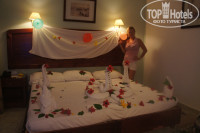 На рецепции нас любезно встретил молодой человек в очках- сносно изъеснявшийся по русски.Скажу сразу- денег у нас при заселении никто не вымогал, таксу в 20 долларов не объявлял, в паспорт я вложила 5 долларов , а сверху шоколад Аленка.Я улыбнувшись попросили нормальный номер с видом на море, мы его получили- в бунгало на 2 этаже, с видом на сад и кусочком моря- наш корпус был 3-й от пляжа.Получив ключи ,и следуя направлению, которое нам укзали