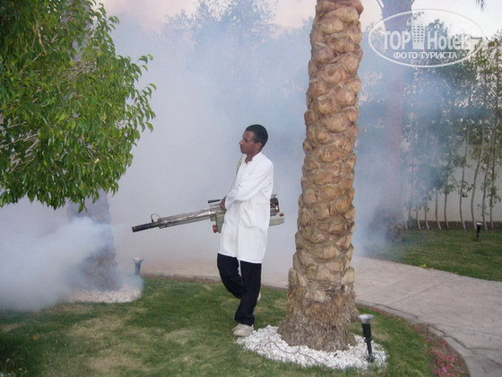 Всё бы ничего, если бы номера не соединялись между собой хлипкими дверями и тонкими стенами. Первую ночь в этом отеле я запомнил. Т.к. сплю я чутко, то сначала я просыпался от проезжающих в соседний отель автобусов, затем от пролетающих самолётов, потом от того, что в соседнем номере начал кашлять какой-то мужчина. Такое впечатление, что он кашлял прямо мне в ухо. Ну, а венцом явился процесс уничтожения комаров на территории отеля. Это достойно отдельного описания. «Фумигатор», как мы его в шутку называли, представляет из себя железную хрень, напоминающую глушитель легкового автомобиля. Специально обученный человек одевает на себя эту конструкцию как автомат, потом эту фигню заводят, и из неё изрыгается густой и вонючий дым! Смерть комарам и доброго утра туристам, так как процесс уничтожения насекомых происходил около 6-ти утра ежедневно! Я сначала даже испугался от звука работающего «фумигатора». Правда, к концу отдыха привык и просыпаясь от этих звуков думал : «Уже 6 часов, через час вставать и чесать на пляж- занимать лежаки!»