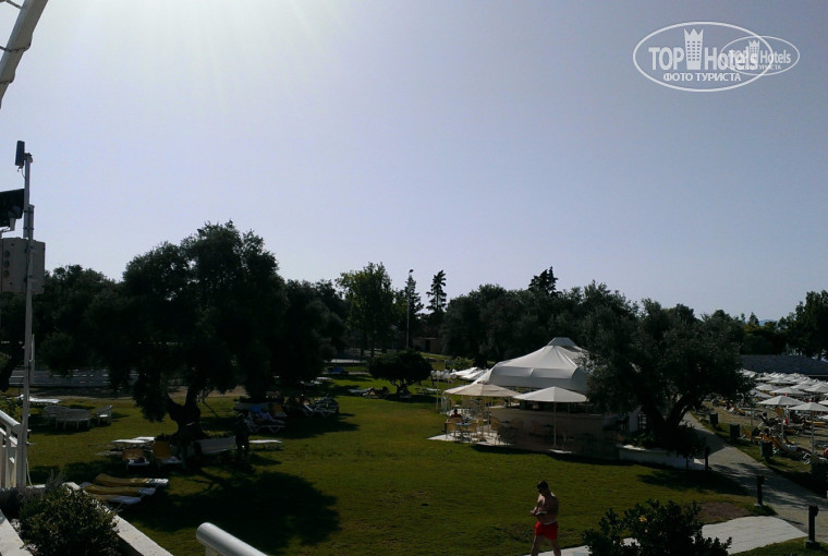 Территория отеля очень зелёная и уютная. На территории есть волейбольная площадка, стоят столики для игры в карты, под оливами расположены лежаки. Вечером видно как за территорией тщательно ухаживают - расставляют лежаки на пляже, поливают газоны и оливы. Всегда кто-то что-то делал.
