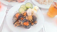 Ужины - это вообще песня! Всегда что-то жарилось: сувлаки - маленькие шашлычки, или барабулька - мы ею объедались, какая вкусная, тигровые креветки гриль, осьминоги - и отдельно и в салатах были очень часто, мидии, какая-то огромная и вкусная рыба, которую прямо при тебе разделывали и порционно подавали, бараньи ножки, вобщем - выбор очень хороший. Единственный минус по питанию - это то, что на ужин порой стояли салаты, сделанные из овощей, которые подавались на обед. Но мы их никогда не брали, это было видно, и можно было выбрать много чего другого. Я так понимаю, что это обычная практика всех отелей, не только греческих. Никогда и ни разу не было ничего несвежего, или подозрительного.