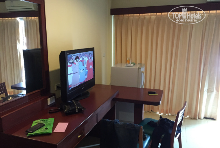 Номер на 3 этаже, с видом на внутренний двор. Вечерами было тихо, никто не шумел, высыпались "на ура"! В номере есть кондиционер, бесплатный сейф, телевизор с парой русских каналов, холодильник, в который ежедневно ставили две бесплатные бутылки воды. Остальное в холодильнике платно, пиво, лимонад, чипсы (стоимость не уточняли), бесплатный вай-фай, пароль выдали на стойке ресепции при заселении. Душ совмещен с туалетом, ежедневно меняли полотенца, есть гель для душа, мыло и шапочка для душа, фена нет, берите с собой. Уборка номеров каждый день. Оставляли 30-50 батт. В номере всё работало, никакой живности не было, чисто и аккуратно.