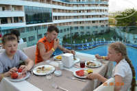 Сразу скажу, отдыхали двумя семьями. Я, жена, дочь (9 лет), сын (16 лет). У нас была уже не первая поездка. И наши друзья – муж с женой и сын (10 лет). Для них была первая поездка. Выбирали долго. С января по май было просмотрено множество отелей. Выбор остановили на Water Planet, и поняли, что не ошиблись. Хотели бы снова сюда вернуться, и отметить здесь два наших праздника – мое день рождения и годовщину свадьбы в июле.