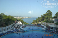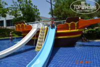 Территория отеля с аквапарком очень большая, зеленая и ухоженная. Везде постоянно убирают, поливают, подстригают деревья и газоны. На территории два больших бассейна, и еще один «инфинити» находится на крыше ресторана. Есть детский мини-клуб, амфитеатр, теннисный корт. В бассейнах можно плавать до ночи.