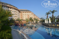 Отдыхали с отеле в апреле 2014 (отпуск был не запланированным,взяли путевку за пару дней до вылета). Приехали в отель утром,за 20$-засели сразу же,кто по жадничал сидели в холле до 14 часов. Нам дали номер 123 на первом этаже с видом на бассейн. В Турции были первый раз-поэтому сравнивать не с чем. Отель понравился ооооочень,но он больше подходит для отдыха с детьми...Детская анимация на 5+,На территории аквапарк/лунапарк-бассейн с морской водой,подогреваемый и крытый бассейн, SPA центр с сауной :) Питание хорошее,особенно порадовало количество сладкого...ммммм....Кстати есть детское кафе с отдельным меню. На территории так же есть места,где можно поесть...возле гольфа чудо кафе,где очень вкусные нагетсы :) и пиво в стекле (кому интересно). Возле основного бассейна делают вкусные лепешки, а после обеда дают мороженое.....