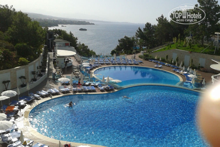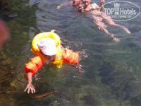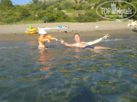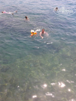 Сам пляж – это 3-х уровневый пирс. Вход в море - спуск по лестнице или прыжок с вышки небольшой. Старший ребёнок прыгал иногда. С детьми, конечно, не совсем удобно, но даже наша маленькая дочь с нарукавниками ничего не боялась, её было не вытащить из воды, и я была спокойна. А вот с точки зрения моего мужа это самый большой минус отеля. При том, что он хорошо плавает, но ему хотелось на песочке полежать, чтобы волны плескались по ногам, чтобы походить просто по водичке. Поэтому мы раз в день ходили на так называемый «дикий пляж» в 15 минут ходьбы. Он не оборудованный. Там вход в море пологий. Рядом идут пляжи соседних отелей с шезлонгами. Можно спокойно отдыхать там – никто не выгоняет. Туда от отеля даже какой-то транспорт ходил, но мы всё время ходили пешком нашей большой дружной компанией. С одной стороны и хорошо пройтись, по пути магазинчик был, где на обратном пути покупали иногда фрукты. Очень вкусная черешня была.
