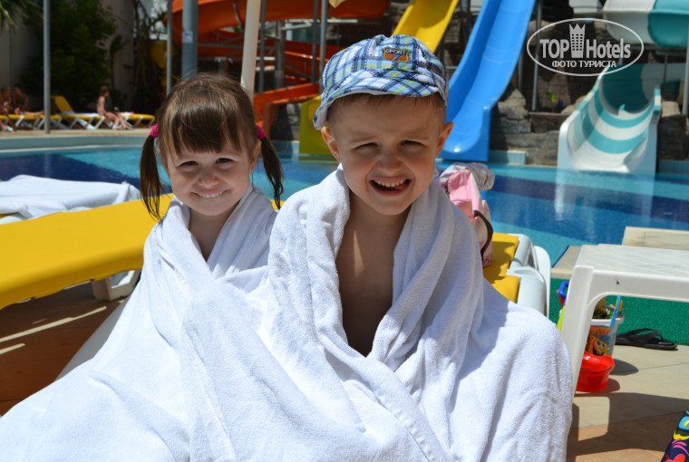 На территории есть детский бассейн с маленькими горками горками и для детей постарше и взрослых горки, дети были в восторге, и рядом находился детский клуб с небольшой площадкой. Площадка небольшая ,но детей оттуда было не вытащить. Клуб детский очень хороший, девочки молодцы, с детками занимаются, есть просмотр мультиков на большом экране, по субботам детей катают на банане бесплатно на море.