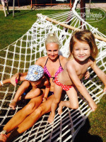 Есть хорошая детская площадка, детки постоянно туда бегали, гамаки, батут, детские развлекаловки. Не понравилось то , что батут был платный и детские машины и все игры. Моих было оттуда не вытащить((( Так же около кафешки детский клуб, там можно днем порисовать, поиграть....