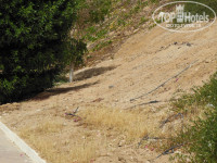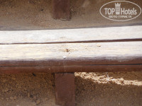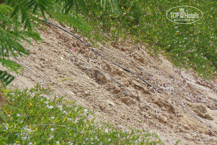 Территория отеля грязная, не убирается, насаждения сухие, поэтому на пальмах и нет фиников, ничего не поливается, система для полива сломана, шланги вырваны. Кругом мусор. На лестнице, которая ведет к морю, высоко торчащие гвозди, можно получить травму.