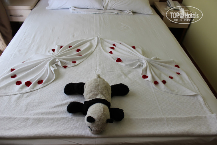 Заселение: До отеля ехали 3 часа 10 минут. На ресепшене вас встретит {удалено модератором}, правда бейджа на нем вы не обнаружите, т.к. он МЕНЕДЖЕР, как его там называют коллеги. Он не ждет, как это принято в Турции, чаевых в паспорте, а продает в буквальном смысле этого слова, абсолютно все номера за 30$!!! И торг у него практически не уместен! Я конечно не стала покупать номер, т.к. я его в принципе уже купила в тур агентстве! В итоге мне дали точно такой же номер, как и другим людям, отдавшим деньги, в корпусе А. Номер был со свежим ремонтом, но без горячей воды! По словам проживающих воды нет уже неделю! Я в этот же день переехала в корпус В. Номер один в один. И при мне этот наглюк мой номер, из которого я выехала, продал девушке с ребенком за 20$ (видимо сделал скидку). Самый новый корпус - блок С. Номера там ничем не отличаются от тех что давали мне, но в блоках А и В номера через один с новой и старой мебелью, как повезет, поэтому не стоит переплачивать за блок С. Фото этого чудо-рецепшианиста я прикладываю, знакомьтесь.