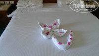 В номере все стандартно, большая кровать, полотенца меняли по требованию, фигруки из полотенец и подручных предметов делали. Телевизор новый, но ни разу не включила. Светильники, конечно, староваты, шторы тоже давно не сдавали в чистку, но в целом все нормально, убирался номер хорошо, ванные принадлежности пополнялись ежедневно.