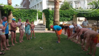 Анимация. Утром делали зарядку, потом играли в волейбол, затем игра "бочча" (эта игра так понравилась, что дома купили ее, и сейчас играем).