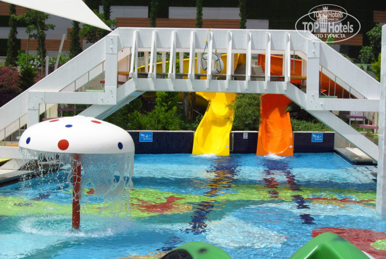 Детская площадка (небольшая) есть при пляжном баре. В отеле при выходе к бассейнам есть детский мини-клуб, работающий в определенные часы. Помещение клуба очень просторное и хорошо укомплектовано игрушками и всякими домиками, машинками, качалками и т.п. Есть комната с кроватками. С детьми занимаются 2 девушки, владеющие русским. Также бывает детская дискотека, во время ужина девушки приглашают детей.