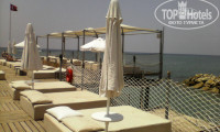 пляж песок с мелкой галькой.чистенький лежаки в изобилии мы любили на пирсе лежать там кожанные как 2 спальная кровать лежаки фантастические..у басейна ближе к пирсу тоже такие же..проблем с местом нет..всегда есть свободные.море прелесть..теплое ласковое..Нам повезло!!погода прелесть..