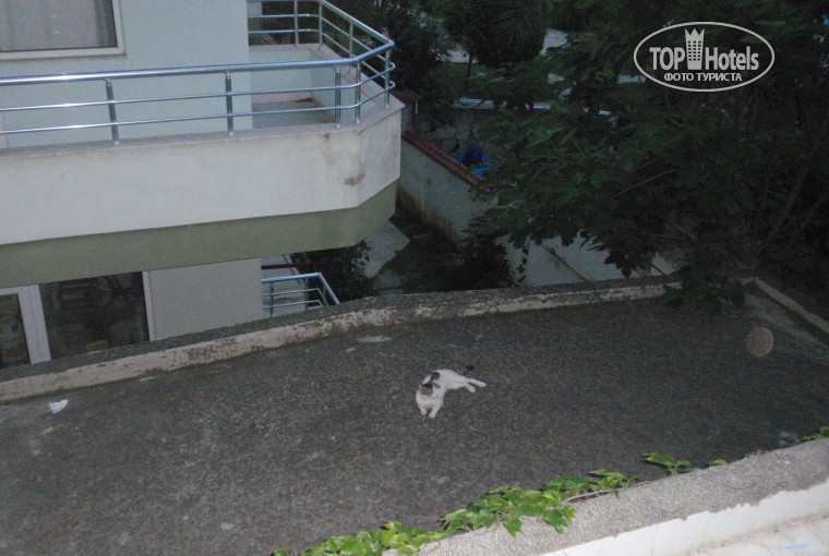 В отеле имеются чудесные котики: ухоженные и "официальные" черно-белая и рыженький, и приблудные уличные черепашка и бело-серый с нахальной рожей. В последний день пребывания, вернувшись с пляжа (а балкон мы не закрывали, потому что было жарко), мы обнаружили в нашем номере этого бело-серого, вольготно развалившегося на кровати. Судя по запаху, он по-хозяйски прошелся по всему номеру, и пометил все, что плохо лежало. На кровати сфоткать не успели, но вот он за балконом номера. И да, видно расстояние до соседнего отеля.