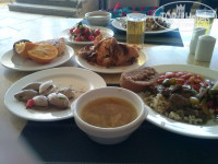 "Ресторан". Название "столовая" больше подходит. Как и все мы сталкивались с проблемой салфеток, вилок и свободных ЧИСТЫХ мест. Но тем не менее, всегда всё находилось, просто приходилось тратить время на поиски. Еда вкусная, не испорченная (проблем с пищеварением ни разу не возникало), всегда всё есть, если закончилось блюдо - сразу несут новое. Очереди к поварам на улице то огромные, то нет совсем. Мы приловчились вначале брать еду со шведского стола, садиться поближе к поварам на улице, и идти к ним за едой, когда нет очереди. Минус для меня - нет тарелок именно возле поваров на улице, надо тарелку из ресторана нести. Вкусно делают курицу на гриле, кебаб. Многие пишут что порции не большие - мы брали по 2 тарелки))) и если очень нравилось блюдо, то подходили к ним несколько раз, никогда не говорили "Эй, я тебе уже давал, больше не получишь". Из фруктов в основном апельсины, дыня, яблоки. Иногда был арбуз, бананы, грейпфруты, финики, лаймы, персики. Особого разнообразия в еде не было, но никто не заставляет вас брать каждый день все блюда, можно ведь брать несколько и чередовать их.