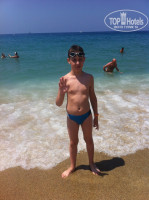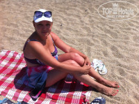Пляж с мелким песочком,прозрачная вода.Лежаки и зонтики платные.Мы загорали без них,на своих полотенцах.