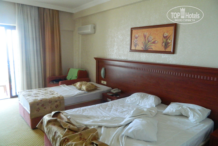 В отель мы прибыли в 19.00 и нас заселили быстро, минут за 15-20, не смотря на то, что сразу заселялось человек 10. Номер достался хороший с видом на море, хотя за него мы не платили. В номере были 2 кровати(двухспальная и полуторка), хотя жили мы вдвоем, туалет, душ, ванна, фен, сплит, небольшой телевизор, шкаф для одежды, сейф и балкон, с которого открывался потрясающий вид на море. На двоих нам дали 5 чистых полотенец, шампунь, мыло, гель для душа и кондиционер для волос. В номере чисто и уютно.