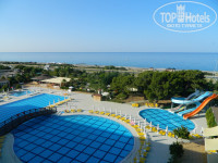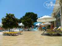 Территория отеля не большая, но комфортная, посажено много деревьев и пальм. Есть 3 бассейна, 3 водные горки, амфитеатр, бар.