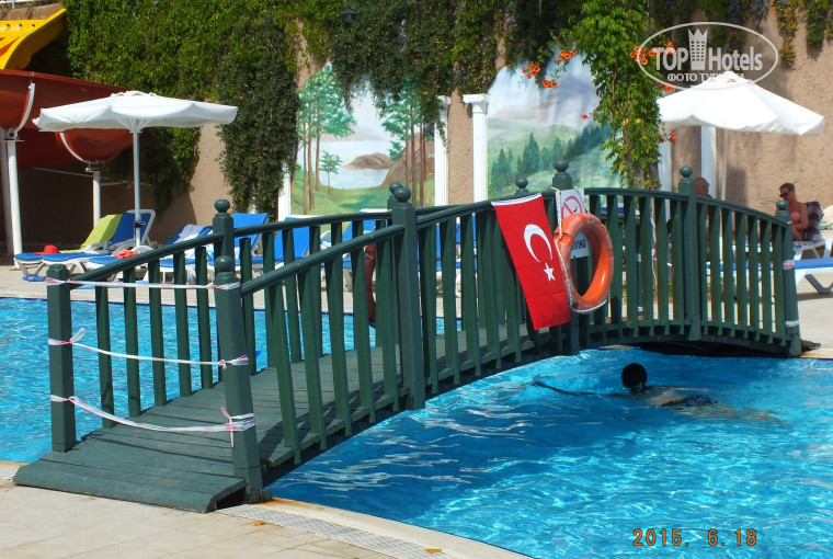 Отдыхали с 5 по 19 июня 2 взрослых, 3 детей. 5 раз в Турции. По порядку: за 10$ Мурат разместил в 2 комнатном номере, с одним недостатком- отсутствие балкона. Но зато ДВЕ комнаты, вместо одной с 2 ярусной кроватью! Питание: никто голодным не был, на завтрак все как и везде: йогурт, творог, молоко, хлопья-шарики, соевые колбасы, вареные яйца и т.д. Дальше- почти всегда курица, реже говядина, овощей (помидоры, огурцы, перец, трава)- полно. До пляжа я за 7 минут доходил, с детьми, конечно, дольше. Но ездит каждый час бесплатный минибас. Пляж песочный, лежаков немного, надо приходить раньше, чтобы хватило. Полотенце свое. С детской анимацией "попали"- никакая, только вечером игра на сцене и минидиско. Но, между тем, огромный респект Савашу и милому Ибрахиму. Саваш из кожи лез, уговаривая взрослых на дартс, бочу, вотерполо, вечерние шоу. Публика в отеле (преимущественно россияне) на редкость, наискушнейшие товарищи, хотя отель семейный- очень много детей, которых днем "пасут" родители. На шоу "Мисс Отель" оделся в сарафан, турки к этому отнеслись снисходительно, в отличие от россиян. У наших с юмором огромный напряг, это не немцы. Сейф не брали, хотя с собой 3000 $ было. Никогда не пользуемся. Бармены и Гарсоны- душки, особенно если с ними гутарить по- турецки. Лучше посещать столовку чуть после открытия, когда все есть. В июне из фруктов: арбуз, дыня, апельсин. За забором все фрукты 3 бакса. Дешевле доллара ничего нет. Даже морожного. Джинсы- не ниже 40, майка- не меньше 15$. Приехав в Москву почувствовал себя богатым. С Османом (продавец попкорна и бармен на пляже) можно договориться покупать вату и попкорн дешевле. Осторожно, он русский понимает. Продавцы, особенно Хасан, легко опускают цену до базарной за стенами отеля. Убиралась в номере мадам весьма добросовестно, может, за комплименты, которые я ей дарил на турецком. За 2 недели я оставил ей, к своему стыду всего 2 доллара. В Манавгат и Сиде на базар смысла ездить особого нет, все можно купить на местном базаре (из отеля направо), главное до посинения торговаться. Восточные сладости перед покупкой надо пробовать- сэкономив можно попасть на химические. В Манавгате рекомендую сплавать на водопады. Стоит 10$. Отдельная "песня" гид- ты ему интересен ТОЛЬКО как покупатель экскурсий. Не более. Когда у бассейна пропали мои шорты (как оказалось, их забрали в номер наши знакомые), гид Тамерлан молвил "оставили без присмотра? Это Ваши проблемы". Люди, которым мои шмотки по барабану, бармен Нузбех и впариватель поездок за кожей успокоили, сказав, что есть камера, которую вечером пойдем смотреть. Лифт очень долго ждать, с коляской каждый день прыгал по ступенькам. Но у нас был 1 этаж. Фотограф Малют не торгуется, но... 17 фоток и диск с 76 я взял за 50 амер. рублей и бутылку водки "5 озер". То есть фото с попугаем на пляже- 160 рэ. Хамам вместо 2 часов по приезду стал бесплатным всего на час. В парилке делать нечего- температура 50 градусов. Горки у бассейна очень травмоопасны. Сотрудники отеля за безопасностью не следят, матов внизу нет. При нас мальчик упал с горки навзничь на бетон. Вызывали скорую. У бассейна другой подскользнулся и сломал руку. Но это уже камни в сторону родителей: не пиво- водку надо вливать в свой желудок и не чесать языком, а следить за своими чадами. У нас трое, и мы успевали и следить и колу пить. Динопарк (динозавры) по дороге в Манавгат име