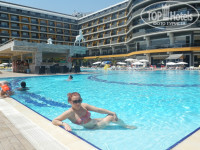 Территория: небольшая, но все компактно. Мы утром ходили на пляж-5мин и там ( песочек, заход в море немножко мелкой гальки а потом песок, пирса нет, есть бар на пляже работает с 10ч. (пиво с 11ч.) до 16ч. В 11ч. мы уходили к бассейну с горками ( вот здесь мы отрывались от души), плохо что мало лежаков, а зонтов и того меньше, из-за этого мы там долго не задерживались ( а жаль). У большого бассейна тоже проблемы с зонтами, постоянно приходилось ходить и искать ( не всегда находили).