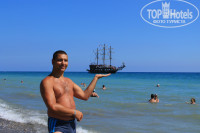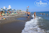 Пляж чистый есть бар, но море было все дни волнительное. даже на банане не катали. Заход галька потом песочек, спуск не крутой. На вышке постоянно дежурил спасатель.