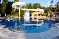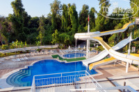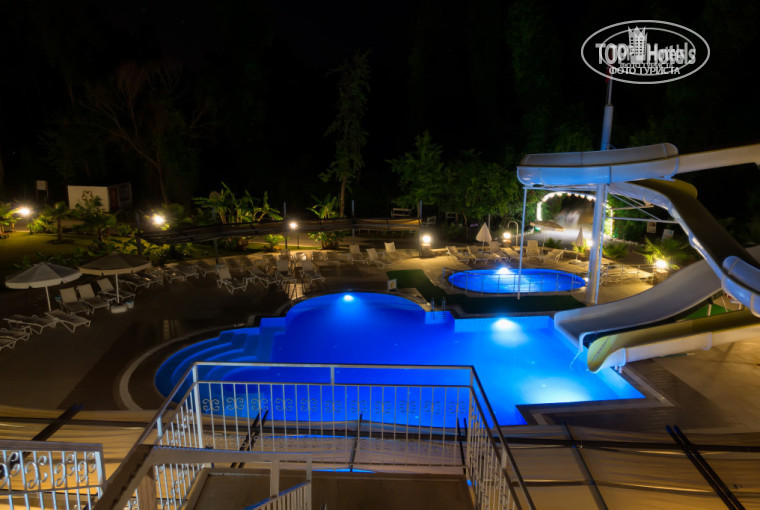 Прогулявшись во время ожидания заселения по местности, мы обнаружили, что отель состоит примерно из 20 трехэтажных домиков, расположенных на большой территории, имеется 5 бассейнов в основном глубиной 140 см, хотя есть и «взрослый» глубиной 180 см, а также детский бассейн для совсем маленьких, на территории одного из бассейнов есть две горки.